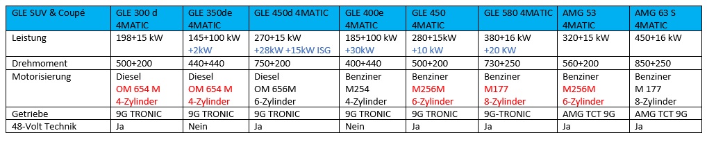 O GLE 350 de 4MATIC vem com o motor OM654M de 4 cilindros e tem 145+100 kW – mais 2 kW de potência que o motor anterior – e 440+440 Nm de torque. O GLE 400 e 4MATIC mantém-se com o motor M 254 de 4 cilindros a gasolina, mas passa a ter mais 30 kW de potência com o motor a gasolina e chega assim a 185 + 100 kW e 400 + 440 Nm de torque. O GLE 580 4MATIC é o primeiro a usar o motor de 8 cilindros M 177 com tecnologia de 48 volts, com a variante fornecendo 20 kW a mais de potência com o motor de combustão – em comparação com o antecessor: 380 + 16 kW e 730 + 250 Nm de torque.