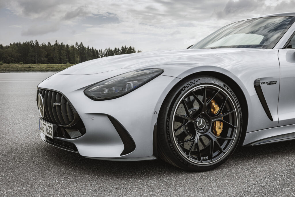 O novo AMG GT apresenta um eixo dianteiro multibraços com cinco ligamentos, que estão dispostos completamente dentro do aro. Os elementos de controle da roda e suspensão, que são independentes um do outro, permitem uma alta aceleração lateral com influência mínima de acionamento no sistema de direção. Uma construção espacial de 5 elos também orienta as rodas no eixo traseiro. Para reduzir as massas não suspensas, todos os braços da suspensão, articulações da direção e suportes das rodas nos eixos dianteiro e traseiro do novo AMG GT são feitos de alumínio forjado. O conceito multibraço guia cada roda com movimentos elásticos mínimos. A alta curvatura e a rigidez do dedo do pé não devem apenas permitir altas velocidades nas curvas, mas também o contato ideal do motorista com a estrada na área de limite alto da curva. Além disso, o veículo deve ter excelente dinâmica lateral e estabilidade de direção em altas velocidades. Uma conexão direta do amortecedor ao suporte da roda traseira reduz as vibrações e as flutuações indesejáveis da carga da roda. Os elementos de controle da roda e suspensão da roda, que são independentes um do outro, permitem alta aceleração lateral com influência mínima de direção no sistema de direção – também uma característica de conforto.