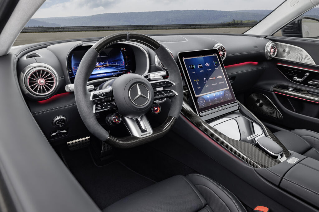 O display de mídia de 11,9 polegadas em tecnologia LCD – idêntico ao SL Roadster – oferece, entre outras coisas, conteúdo específico da AMG em cinco estilos de exibição, incluindo os itens de menu AMG Performance e AMG TRACK PACE. Um head-up display opcional mostra informações e ações em três dimensões e também pode ser usado em diversas variantes de estilo. A luz ambiente oferece 64 cores diferentes, com um total de sete cores de fundo para escolher, cada uma delas atribuída a uma das 64 cores. Duas cores de fundo AMG exclusivas também estão disponíveis na parte inferior.