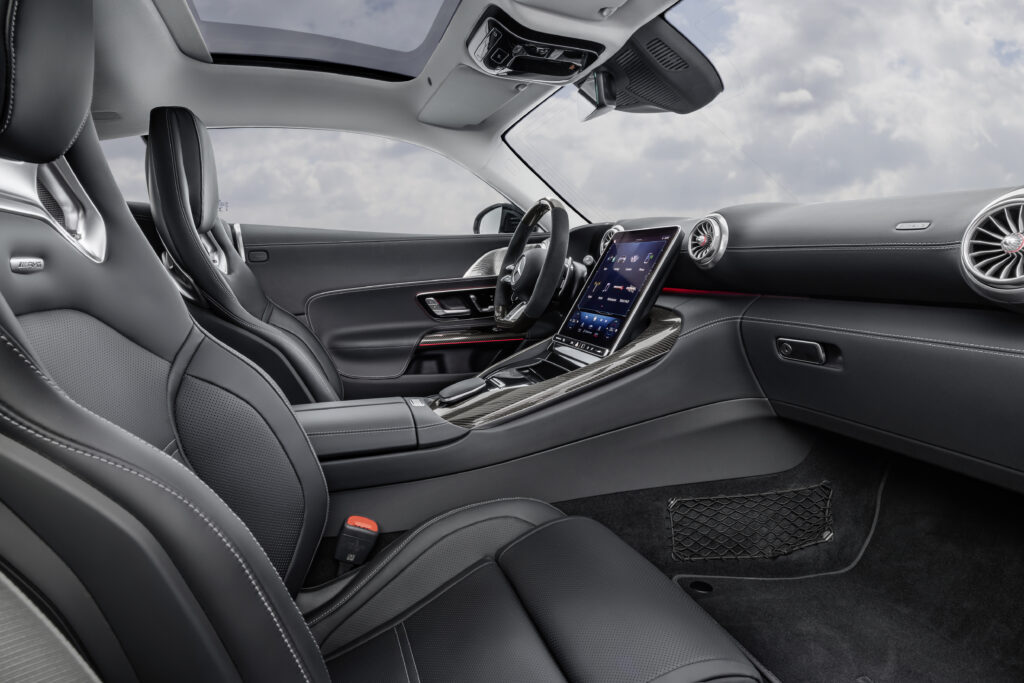O visual interior do novo AMG GT faz uso dos genes de carros esportivos de alto desempenho da AMG – mas, em geral, reflete o interior do já conhecido roadster AMG SL. Você quer pontuar com os materiais e o processamento e “Atenção aos detalhes” no interior. O design do cockpit, até a exibição central no console central, é focado no motorista e deve criar uma impressão geral harmoniosa. O painel de instrumentos totalmente digital é integrado a um visor tridimensional. Um conceito dimensional opcional com 2+2 lugares oferece espaço adicional para pessoas até uma altura máxima de 1,50 metros na parte traseira. Uma porta traseira EASY PACK com HANDSFREE ACCESS também deve facilitar o carregamento e o descarregamento, com os encostos dos bancos traseiros rebatíveis separadamente.
