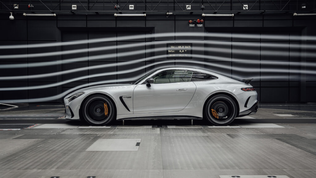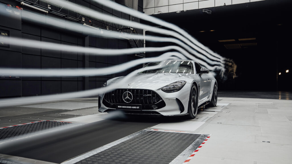 O novo AMG GT possui vários elementos aerodinâmicos ativos na frente e na traseira, com os elementos otimizados para o fluxo sendo perfeitamente integrados ao visual externo. Um destaque técnico no desenvolvimento aerodinâmico é provavelmente o sistema de controle de ar ativo de duas partes AIRPANEL. A primeira parte funciona com aletas verticais que ficam abrigadas atrás da entrada de ar inferior no para-choque dianteiro. A segunda parte está localizada atrás da entrada de ar superior e possui persianas horizontais. Normalmente todas as aletas são fechadas. Esta posição reduz a resistência do ar e permite direcionar o ar para a parte inferior da carroceria. Assim, a elevação frontal é ainda mais reduzida. Somente quando determinadas temperaturas foram atingidas em componentes predefinidos e a necessidade de ar de resfriamento é particularmente alta, as aletas se abrem (o segundo sistema somente a partir de 180 km/h) e permitem que o ar de resfriamento máximo flua para os trocadores de calor.
