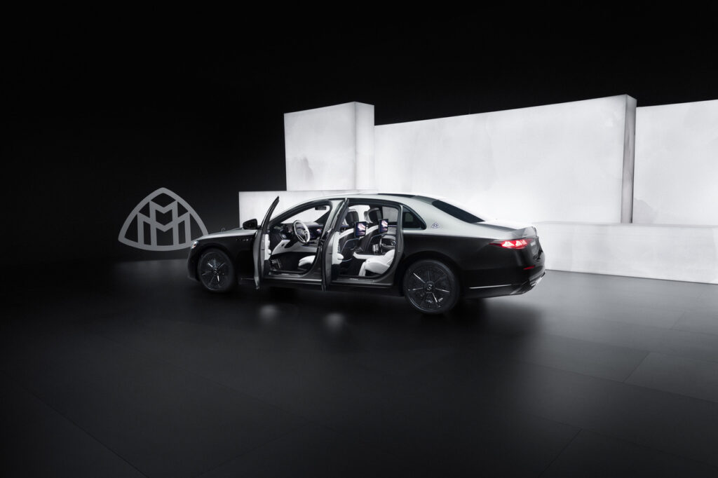 Um projetor discreto integrado nas soleiras laterais projeta a inscrição Maybach no chão ao cumprimentar ou se despedir – um toque sutilmente teatral. Na traseira, as lanternas delicadamente esculpidas espelham os motivos de estrela da dianteira, enquanto a faixa da maçaneta redesenhada em dois tons, agora dividida em cromado e preto brilhante, exemplifica a filosofia da Maybach de tornar até o menor detalhe digno de contemplação.
