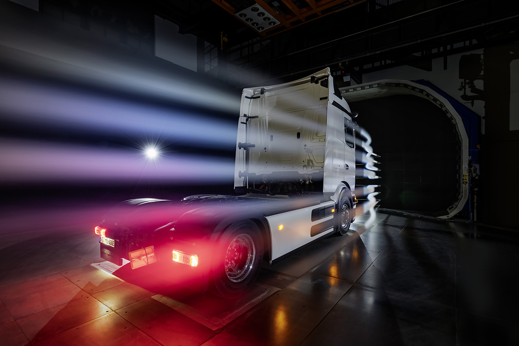 A melhoria da aerodinâmica é particularmente importante para caminhões elétricos a bateria no transporte de longa distância, uma vez que a resistência do ar é um dos principais fatores que influenciam o consumo de energia. Além disso, a resistência do ar reduzida permite que mais energia seja recuperada durante a recuperação, o que leva a um maior alcance. A frente, ampliada em 80 milímetros, permite implementar o formato aerodinâmico da nova cabine. Esta forma simplificada foi desenvolvida usando uma variedade de simulações de fluxo internas, bem como medições de túnel de vento e estradas.