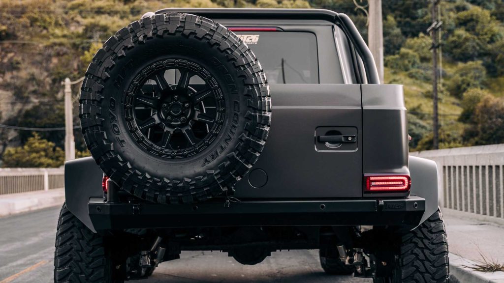 A Pit26 Motorsports escolheu neste caso uma pintura em cinza escuro que se torna semelhante ao preto em algumas condições de iluminação e rodas forjadas de 20 polegadas com beadlocks falsos ou rodas de 18 polegadas com pneus Toyo de mais de 95 cm.