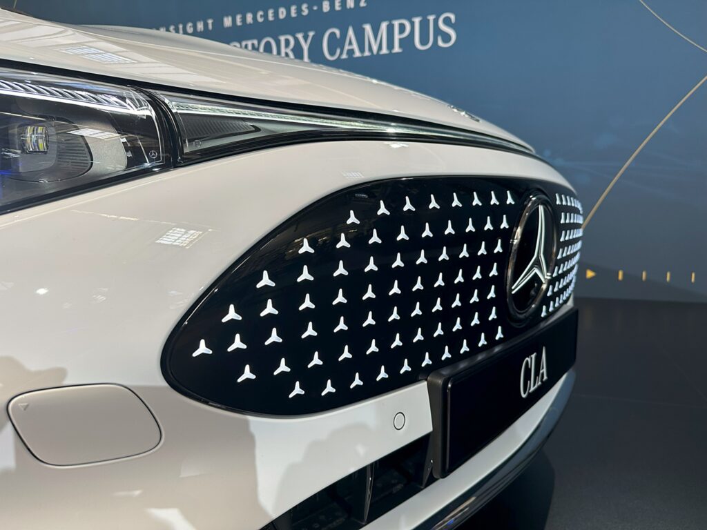 O que particularmente chama a atenção no CLA elétrico a bateria é a grade do radiador fechada com logotipo da marca iluminado e contendo 142 pequenas estrelas da Mercedes – um elemento estético ao qual é preciso algum tempo para se acostumar. Embora a barra de luz contínua na parte traseira com seus elementos LED individuais seja imediatamente atraente, a seção frontal está causando mais discussão. Mas o visual icônico leva tempo para fazer efeito. Na realidade, a frente deixa uma impressão mais harmoniosa do que nas primeiras fotos de imprensa.