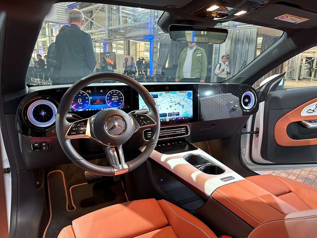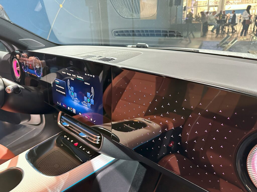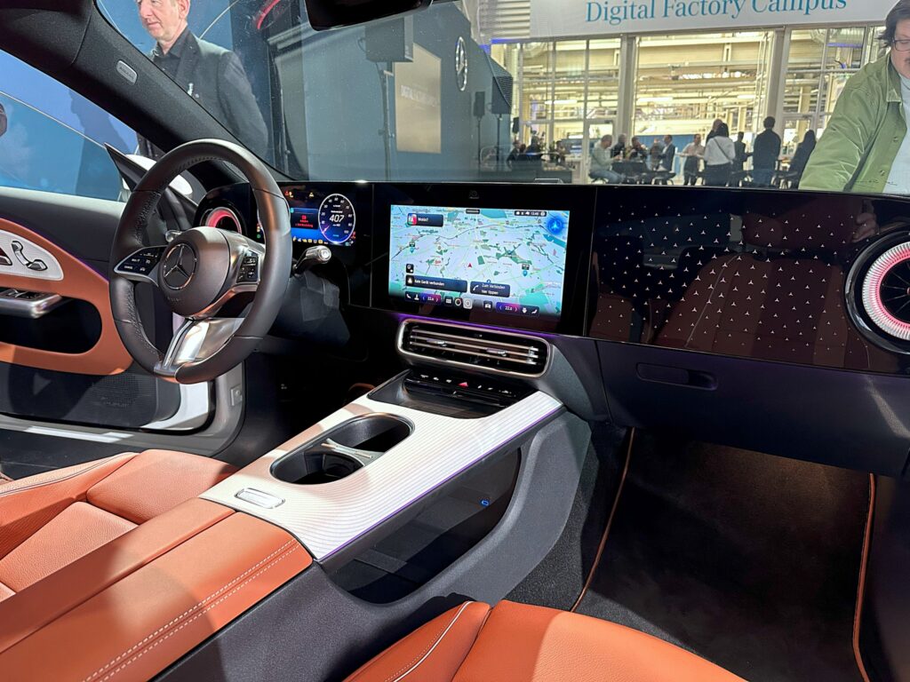 No interior, o site alemão relatou ter ficado particularmente interessados no novo MBUX Superscreen, que não foi instalado neste modelo de pré-produção. Entretanto, a versão em série incluindo o elemento decorativo tem dimensões idênticas. A paisagem exibida, internamente chamada de “O Muro”, parece muito mais harmoniosa na realidade do que nas imagens. A altura das telas fica quase nivelada com o painel. Comparado aos monitores de 10,25 polegadas do antecessor, isso representa uma nova dimensão no cockpit digital. Infelizmente, eles não tiveram a oportunidade de ver o novo MB.OS em ação.