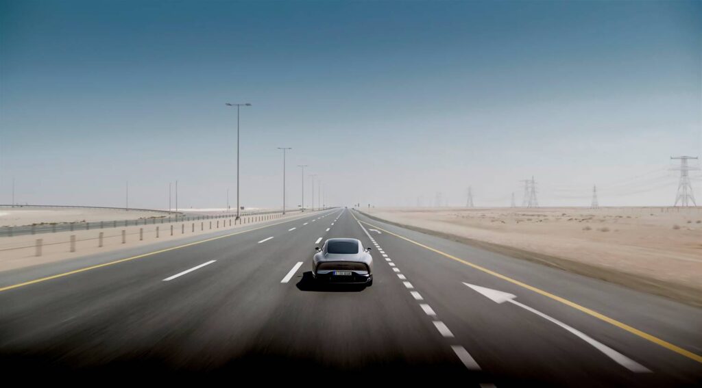Na sua terceira viagem rodoviária de longa distância de mais de 1.000 quilómetros, o programa tecnológico VISION EQXX demonstrou que mesmo o Deserto Arábico não é um obstáculo à eficiência energética. Num perfil de rota desafiador que abrange ruas movimentadas da cidade e deserto aberto, o veículo de teste pioneiro forneceu um consumo de energia elétrica de 7,4 kWh/100 km (8,4 mi/kWh)1. Isto equivale a cerca de 0,9 l/100 km ou 282 MPGe para um veículo movido a gasolina. Em temperaturas ambientes de até 34 graus Celsius (93 graus Fahrenheit), o VISION EQXX superou seu recorde anterior por uma margem considerável.